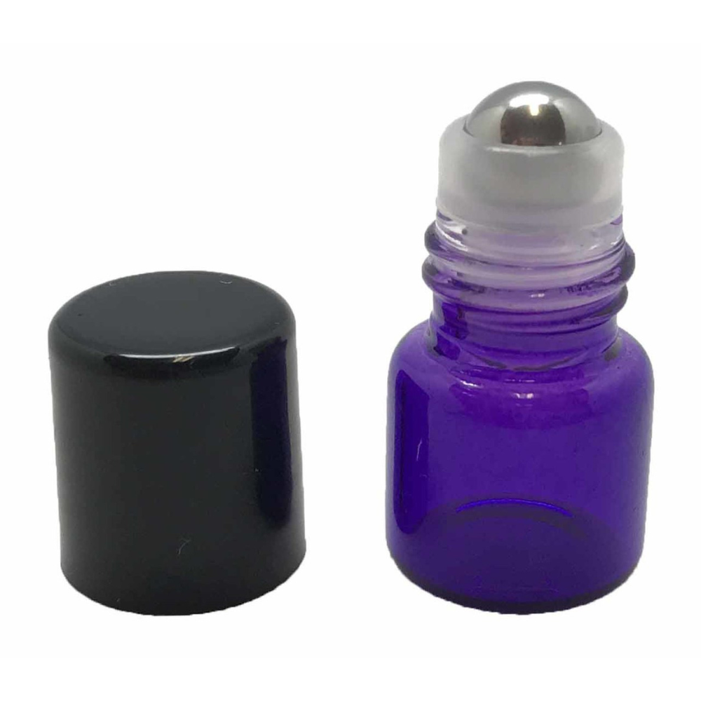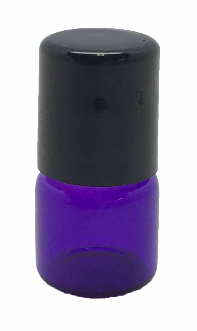 Sample 1ml Purple Glass Bottles with Stainless Steel Metal Rollerballs and Black Lids